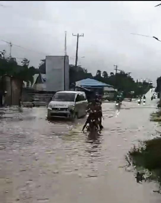 Hujan dengan intensitas tinggi membuat beberapa ruas jalan tergenang. Arus air cukup kuat, namun tidak menimbulkan korban karena genangan cepat surut setelah hujan berhenti.